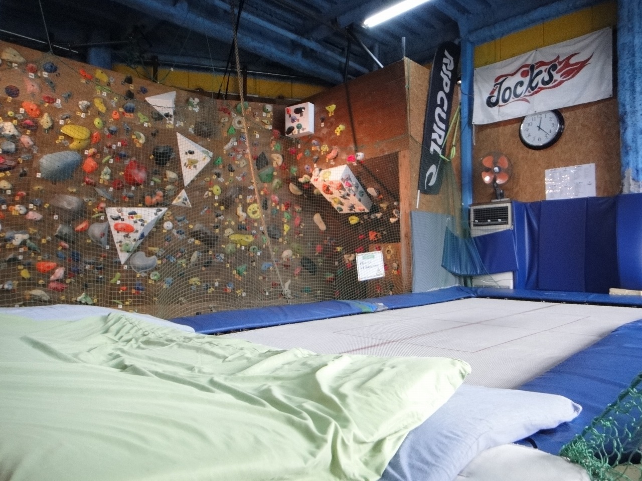 トランポリンとボルダリングで温まりましょう。
