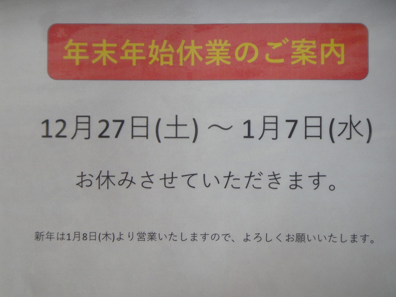 ~~~ 年末年始休業日のお知らせ ~~~