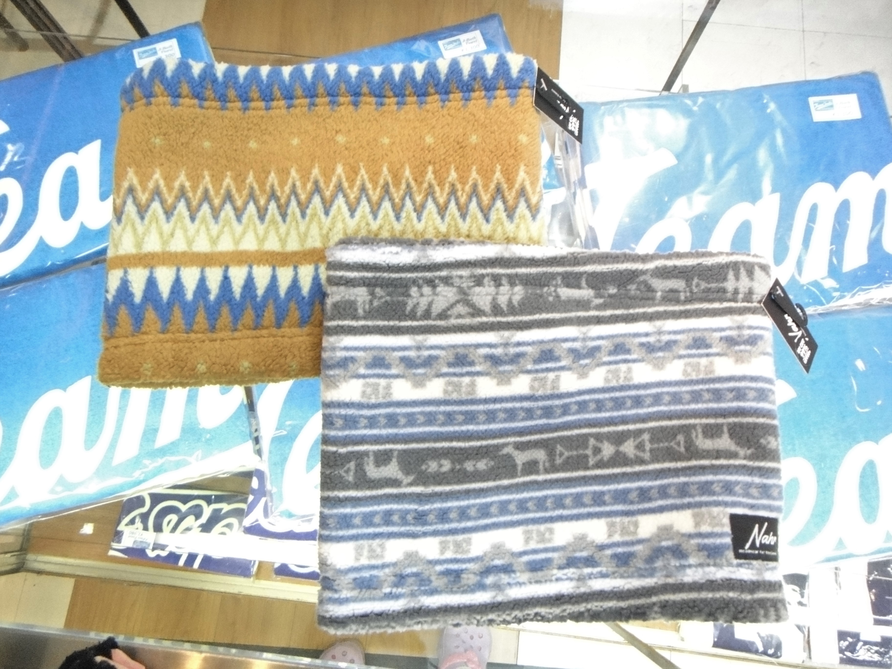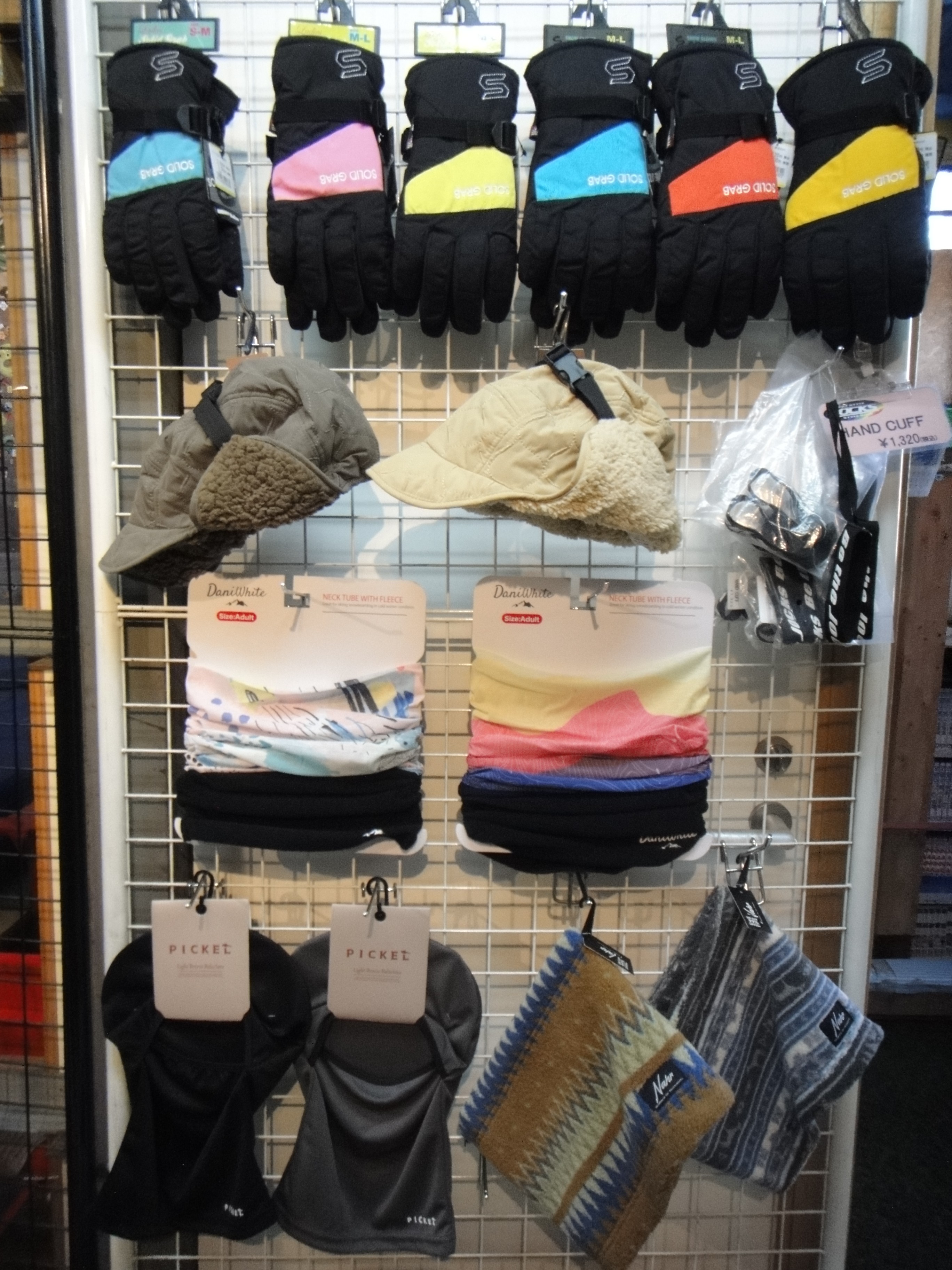 ネックウォーマー、耳ありキャップ、手袋等々、取り揃えていますよ。